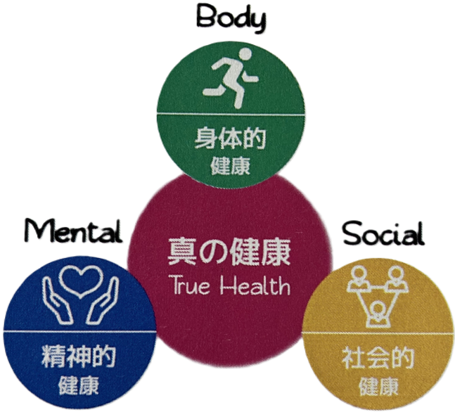 真の健康とは、身体的にも、精神的にも、社会的にも、これら3つの側面がすべて揃い、調和のとれた状態であることを言います。